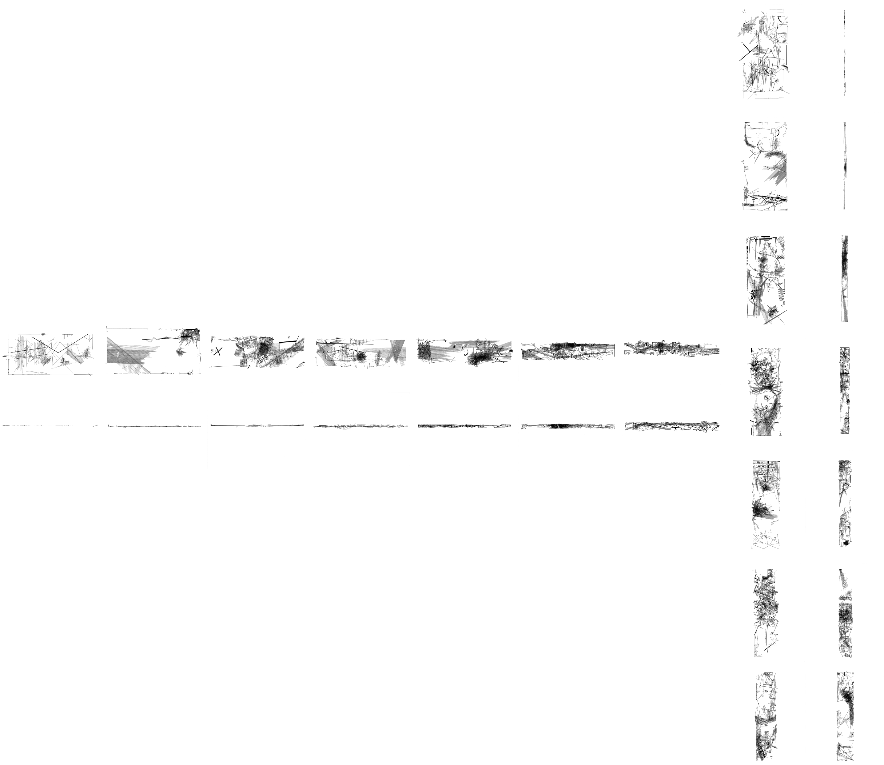 El vacío que hay entre los dibujos, pero también entre el grupo horizontal y vertical, obedece más a un vacío en mi conocimiento que a un vacío espacial remotamente cercano al que hubo entre los dibujos al momento de ser expuestos.