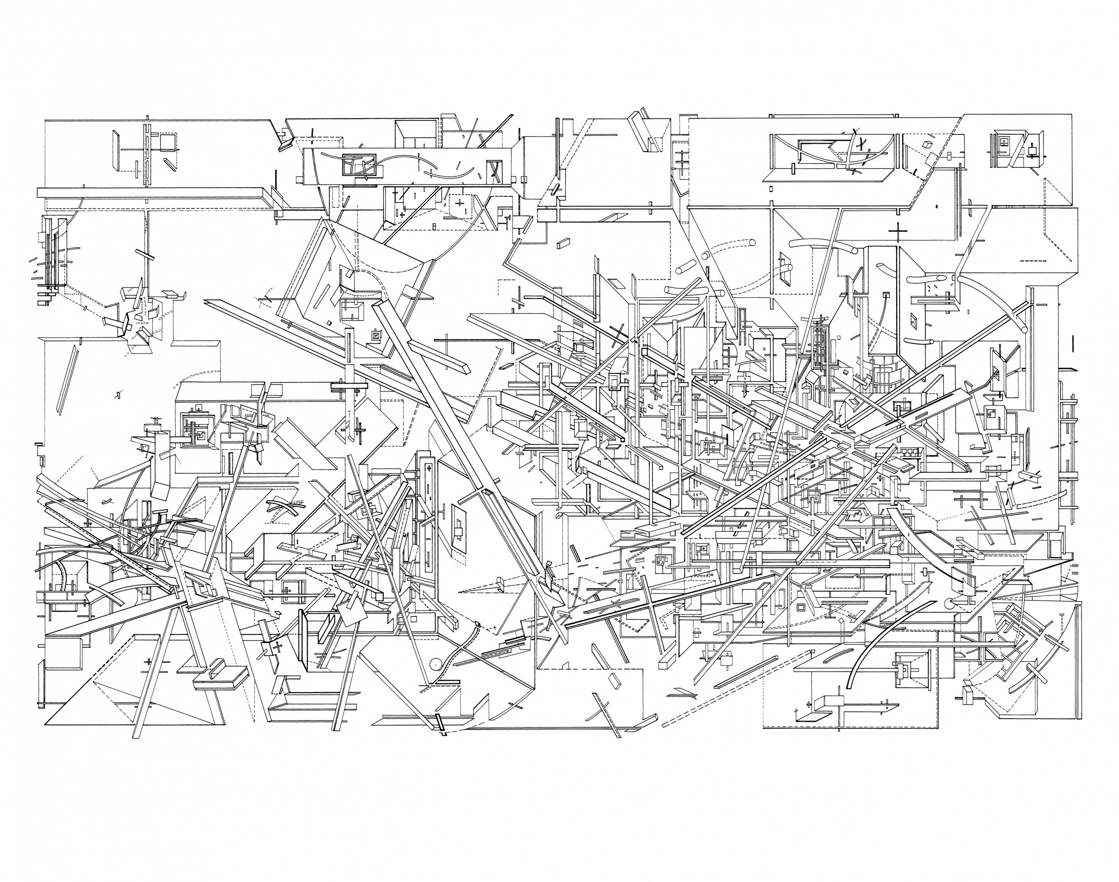 C: Daniel Libeskind, Leakage (Fuga), de la serie Micromegas, 1979. Esta es la única imagen de Micromegas que Evans utilizó en “Frente líneas que no dejan nada atrás”.